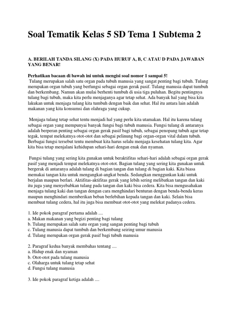 Soal Tematik Kelas 5 Sd Tema 1 Subtema 2 Manusia Dan