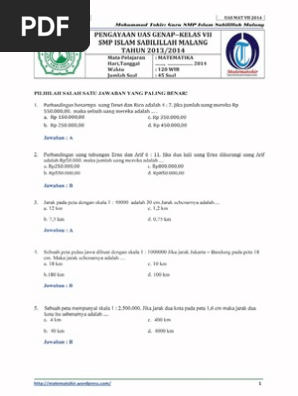 Soal Matematika Smp Kelas 7 Semester 1 2 Dan Kunci Jawaban