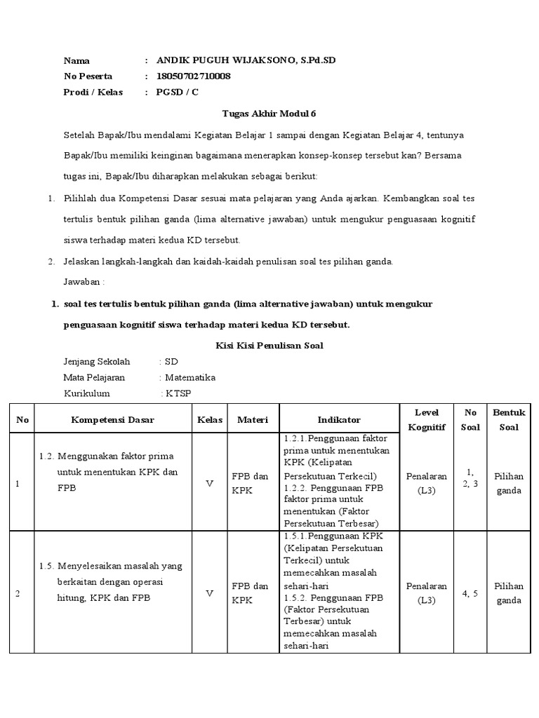 Doc Kisi Kisi Penulisan Soal Soal Tes Dan Kunci Jawaban